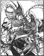 As a 100% fused Crusnik, his regenerative powers are unparalleled and he appears to have his powers active at some level with or without any physical changes being present. He also has the power to reduce himself to a black liquid (presumably his blood) and reconstitute not only his body from it, but clothes and other adornments as well. At one point, he also materialized his body slowly from the back of an armchair.